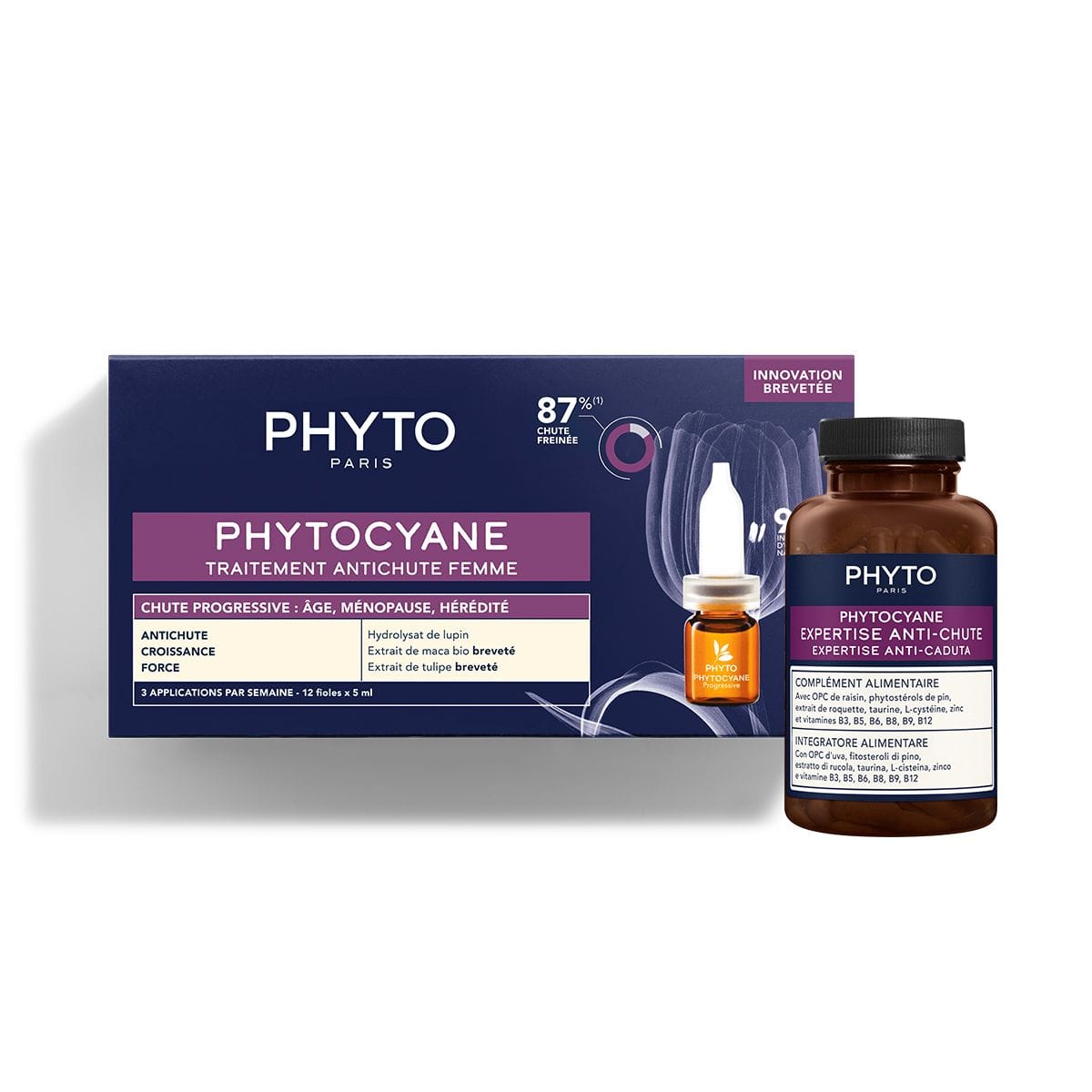 Le rituel complet PHYTOCYANE Antichute de cheveux progressive, pour ralentir la chute progressive des cheveux et stimuler la croissance de cheveux plus forts, plus épais et de meilleure qualité.